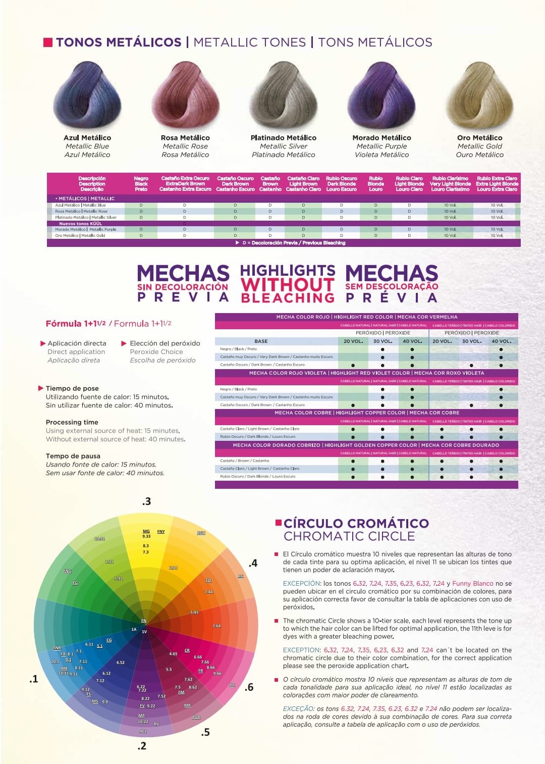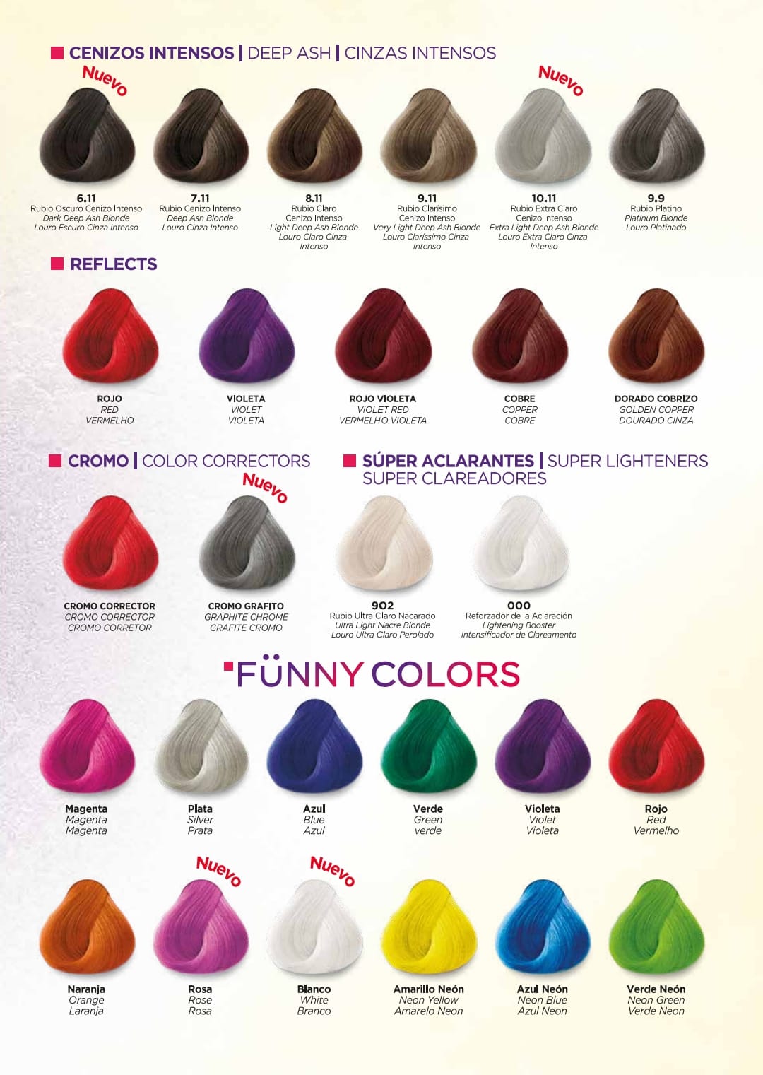 Sistema de coloración que incorpora en su fórmula componentes nutritivos como la proteína de trigo y aceite mineral que brindan ingredientes esenciales para la regeneración del cabello, dando como resultado sedosidad, hidratación, brillo y color intenso.